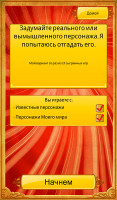 Акинатор может читать ваши мысли и угадывать загаданных вами персонажей, просто задавая вам вопросы. Задумайте реального или выдуманного персонажа и Акинатор попытается его отгадать. Осмелитесь ли вы бросить вызов джинну?НОВОЕ: ПОПРОБУЙТЕ ИГРАТЬ С Моим Миром!