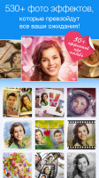 Вас приятно порадует понятный интерфейс фоторедактора и простота создания фотоэффектов. Фото не надо подставлять в шаблон вручную. Вы просто выбираете нужный эффект, монтаж или рамку, потом выбираете фотографию из галереи (или же делаете новую фотографию с помощью камеры телефона) — и уникальный фотоэффект готов!