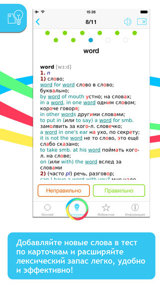 • Добавляйте новые слова в тест по карточкам Slovoed и расширяйте лексический запас легко, удобно и эффективно!