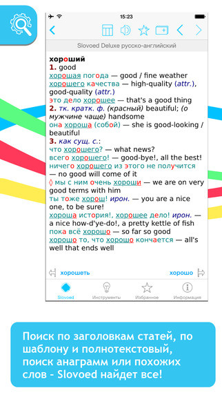 - Новинка для iOS 9! Мы экономим ваше время и приближаем скорость поиска слов к скорости света. Теперь вы можете искать слова в словаре прямо через Spotlight. Эту функцию необходимо активировать настройках словаря.