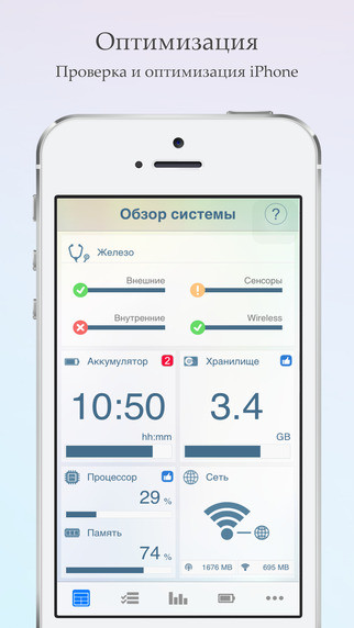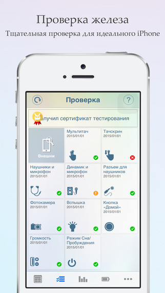 * Быстро и точно проверяет 27 элементов аппаратного обеспечения iPhone.