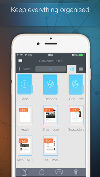 Вы можете хранить и управлять PDF документами, используя удобный файловый менеджер. Кроме традиционного режима списка, файловый менеджер предоставляет наглядный режим предварительного просмотра, где Вы можете управлять файлами и выполнять наиболее частые операции с ними, используя перетаскивание иконок файлов.