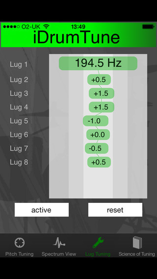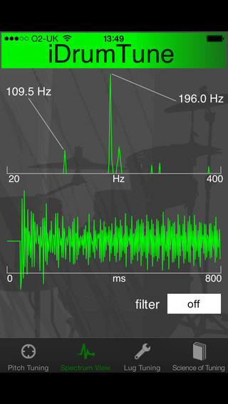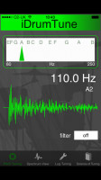 iDrumTune считывает и показывает Вам зарегистрированную звуковую форму волны и показывает самую сильную зарегистрированную частоту.