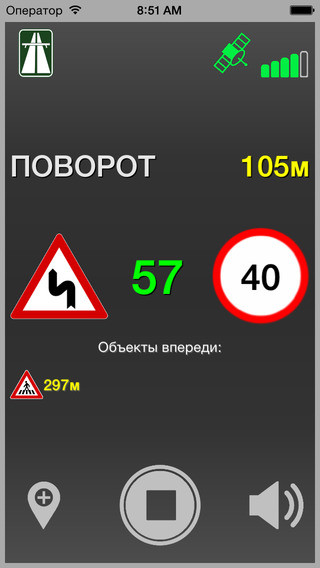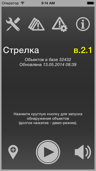 Запуск основного рабочего режима (режима обнаружения) осуществляется круглой кнопкой внизу (кнопка Старт). Что-либо увидеть вы сможете ТОЛЬКО начав движение. Дома и при скорости меньше минимальной, программа показывает только --.