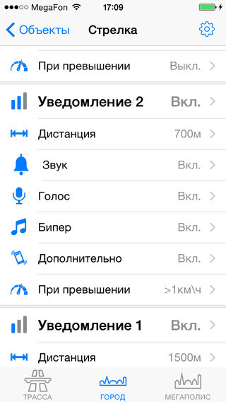 iStrelka отображает на экране объекты по ходу движения автомобиля, указывает тип, расстояние, вашу скорость и ограничение. Кроме этого выдает до трех звуковых и голосовых предупреждений об объекте по настроенным вами расстояниям. Также предупреждает вибрацией, бипером с изменяющейся частотой, а также через напоминания.
