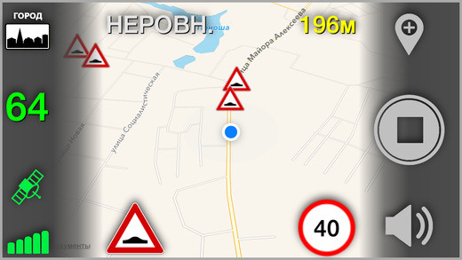 Программа предназначена для предупреждений об опасностях на дорогах (неровностях, поворотах, Cтрелках, постах, Автодориях, Кречетах и т.п.) в России.
