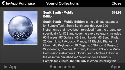 Если более 900 имеющихся в наличии различных звуковых паттернов окажется недостаточно, можно создать свои собственные. Библиотеку звуков можно также расширить, приобретя звуковые пакеты для каждой категории инструментов, включая эффекты. Помимо этого, если потребуются абсолютно все имеющиеся в наличии звуковые сэмплы, можно приобрести полный набор SampleTank Sound Packs.Особенности приложения: