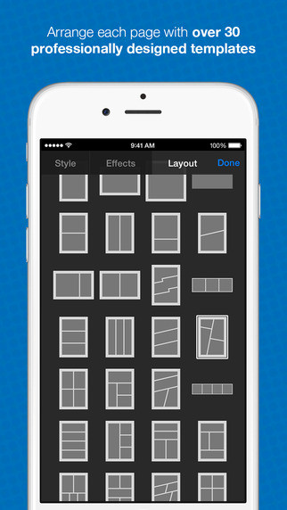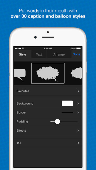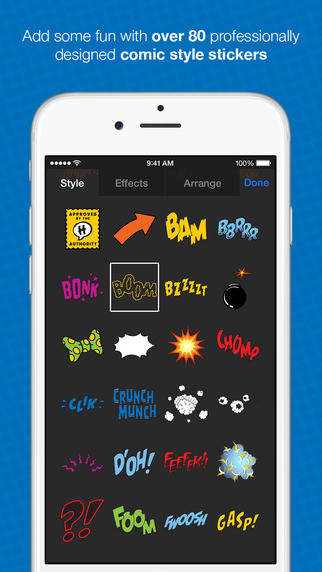 В приложении вы выбираете макет, а котором будет строится ваш комикс, текстуру фона, нужные фотографии, шаблоны подписей, облачков текста и комбинируете все это в нужной последовательности. Для подписей предусмотрено несколько типов шрифтов, разные варианты выравнивания и положения надписи. Изображения могут быть взяты из вашей библиотеки, Facebook или Flickr. В любом случае, картинки можно редактировать, масштабировать, вращать.