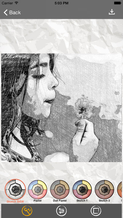 • 20 эффектов (чёрные штрихи, белые штрихи, пастель, эскиз карандашом, цветной эскиз, штамп, растр, штриховка, ...)