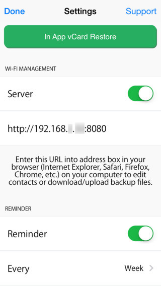 - Сохранение vCard (VCF) резервного файла на ваш компьютер или его загрузка со своего компьютера через Wi-Fi менеджер.