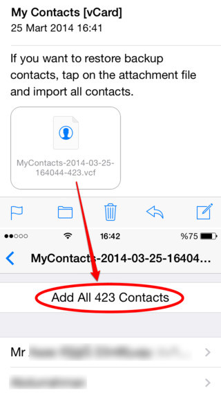 - Легкое восстановление. Не нужно использовать какие-то приложения, чтобы восстановить резервный файл. Только нажмите на *.vcf резервном файле в iPhone, iPod Touch или iPad клиенте почты.