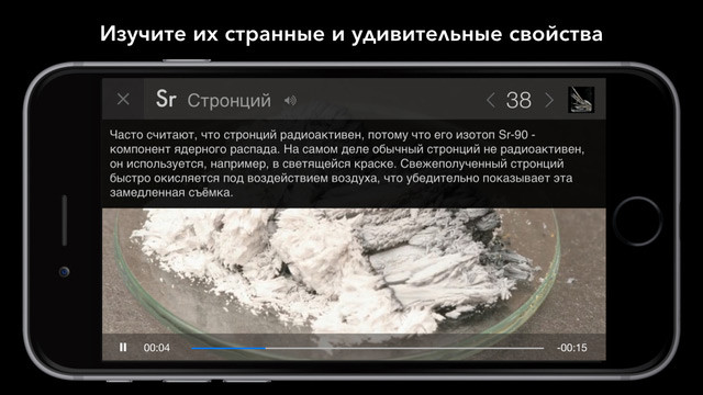 Что будет, если поместить рубидий, высоко реактивный элемент, в воду? А если опустить пушечное ядро в таз полный ртути? “Элементы в Действии” покажут вам поучительные видео для (почти) каждого элемента, от самого странного до самого прекрасного. Элементы собраны для вас в одном месте, и вы можете наслаждаться их исследованием в комфорте и безопасности вашего iPad-а, не подвергаясь опасности смертельного исхода от ожогов, потери рук иди ног, или отравления.