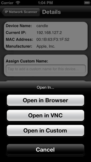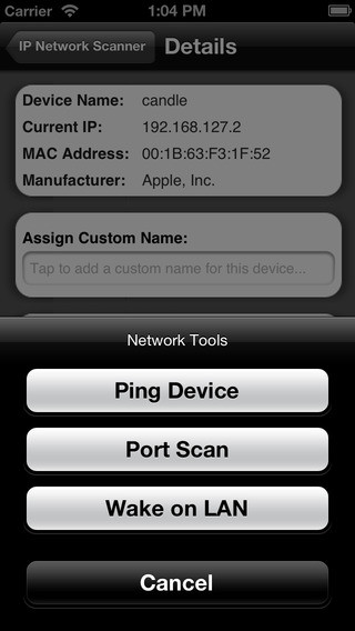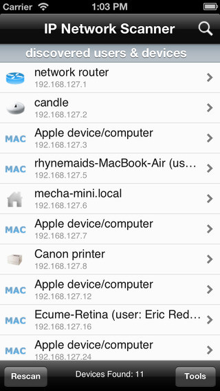 IP Scanner для iOS сканирует Вашу локальную сеть, чтобы определить идентичность всех активных машин и интернет-устройств в LAN. Отличные результаты, всё легко, быстро и интуитивно, чтобы использовать.