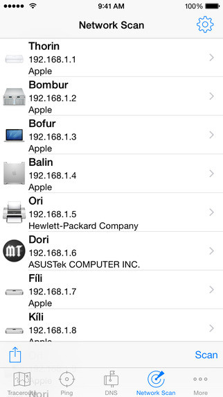 Включает базу данных Мак адреса, поиск имя и адрес изготовителей для любых устройств в Вашей сети.