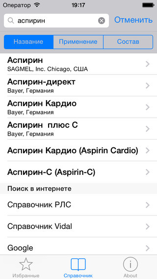 В приложении имеется возможность поиска интересующего препарата по названию, по назначению и по составу.