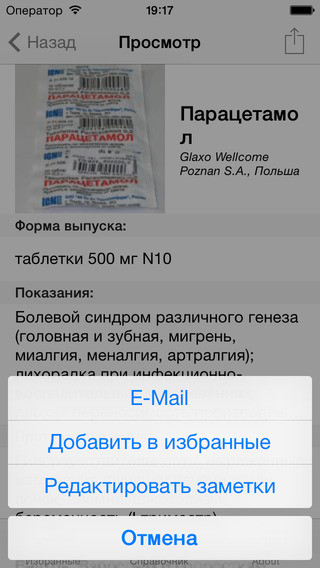 Вы также можете оставлять свои заметки к препарату.Имеется возможность хранить информацию об избранных лекарствах и отправка описания по e-mail.