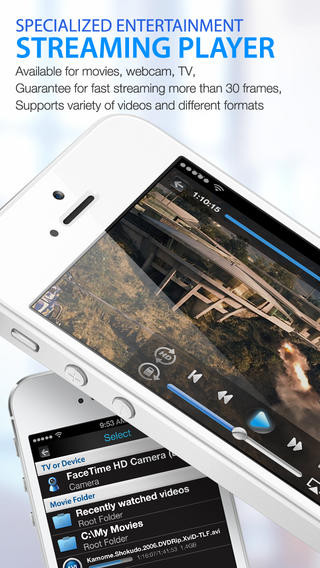 Самое интересное скрывается под кнопкой с треугольником, похожей на кнопку воспроизведения. Дело в том, что после нажатия этой кнопки, вы сможете смотреть видео с вашего настольного компьютера. В качестве источников видео может выступать web-камера или фильмы, указанные в настройках. Для Windows есть вариант просмотра видео с TV-тюнера. Воспроизведение ровное и гладкое, сразу заметен опыт AVPlayer.