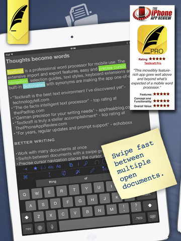 Textkraft - профессиональное приложение для записей, специально разработанное для авторов, редакторов, переводчиков и других продуктивных писателей.Волшебство с Textkraft, у этого есть все документы для Вашего проекта в одном приложении, рядом, не загружая дополнительные расширения. Свайп назад и вперед или используйте обзор документа, чтобы получить доступ к текстам, примечаниям, документам Office, файлам PDF, электронным книгам и другим проектам, в которых Вы нуждаетесь для своей записи.