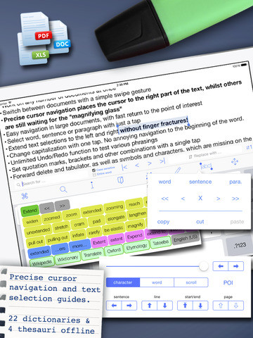 Расширенные оффлайновые словари с синонимами и встроенными онлайновыми ссылками помогают с написанием, языком, выражением, грамматикой, определением и переводом. Точная навигация курсора, быстрые текстовые руководства по выбору и много дополнительных функций клавиатуры упрощают работу ввода и исправления.