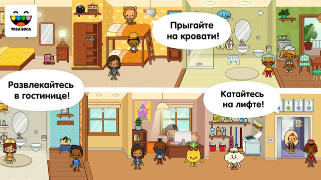 В игре Toca Life: Vacation можно как следует порезвиться в 4 местах. Будьте уверены, у вас не закончатся идеи для своих историй. Хотите начать приключение прямо с аэропорта? Повеселитесь с рентгеновским аппаратом, пройдите в салон самолета и осмотрите его кабину. Потом перекусите и насладитесь полетом! По прибытию у вас будет уйма возможностей проявить себя: сходите в магазин, поглазейте с мостков, поиграйте на пляже, займитесь серфингом и осмотрите гостиницу.ИЗУЧАЙТЕ