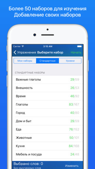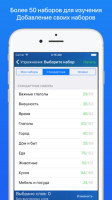 В программу входят более 50 стандартных наборов для изучения и наборов для скачивания! В словаре мы собрали свыше 11000 самых употребляемых слов и выражений и разделили их по группам и уровням. Все слова озвучены! Вы сможете создавать собственные наборы слов или импортировать наборы слов с компьютера с помощью Excel.