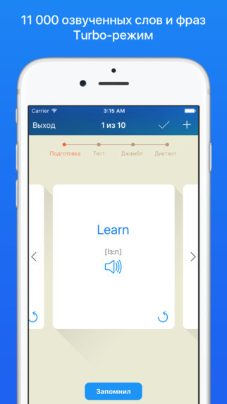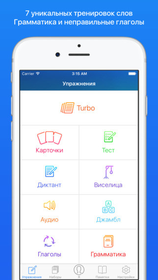 - 7 способов изучения английских слов: турбо, карточки, тест, диктант, виселица, джамбл, аудио диктант;