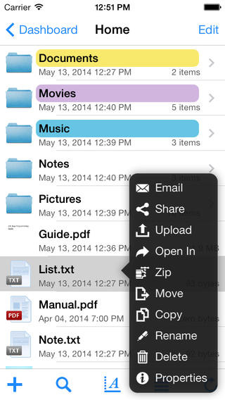 Вы можете посылать документы и файлы из iFiles по электронной почте. Сильно ударьте слева или справа по ячейке файла/папки, чтобы показать popup меню. iFiles имеет возможность записи.