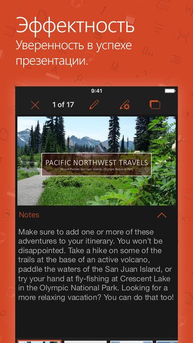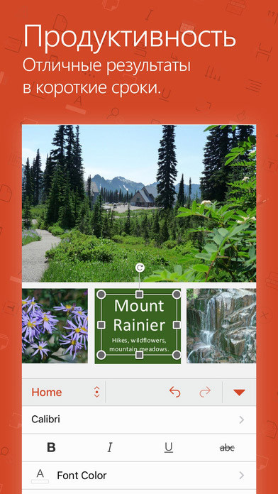 Презентации PowerPoint отлично выглядят на планшете и телефоне. Создавая или редактируя презентации, вы можете быть уверены в том, что они будут отображаться так, как нужно, на ПК, компьютерах Mac, планшетах и телефонах. Хорошо знакомый интерфейс Office и интуитивно понятные сенсорные функции помогут вам легко и быстро освоиться.На iPhone, iPad Air и iPad mini вы можете пользоваться основными возможностями PowerPoint, такими как просмотр, создание и изменение презентаций, бесплатно. Если же вы хотите полный набор функций PowerPoint, оформите соответствующую подписку на Office 365. На iPad Pro создавать и изменять презентации можно только с Office 365.