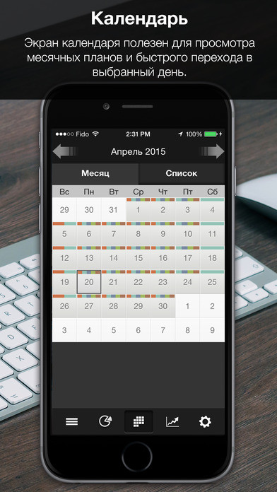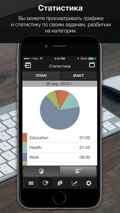 Создавайте задачи, пройдя всего несколько простейших шагов. Планировщик задач позволяет редактировать как индивидуальные задачи, так и цепочки повторяющихся задач. Функционал перевода задач из планируемых в выполненные, позволит вам увидет разницу во времени между планом и фактом на экране графиков и статистики, что может значительно повысить уровнь точности вашего планирования.КАТЕГОРИИ И СТАТИСТИКА