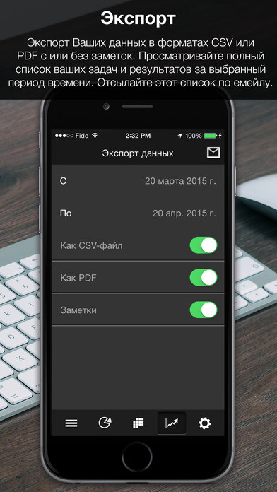 Используйте календарный или списочный режимы для просмотра своих планов, а также специальные графики для анализа Ваших результатов. Цветовая идентификация категорий задач позволит вам быстро увидеть какого типа задачи ждут вашего участия.ЭКСПОРТ И РЕЗЕРВНОЕ КОПИРОВАНИЕ