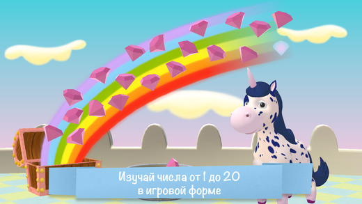 В поездке по этим мирам будет много приятных неожиданностей, единорог вашего ребенка даже прокатится по радуге, чтобы добраться до волшебного замка. С помощью Единорога ваш ребенок будет изучать числа от 1 до 20 в игровой и веселой форме. И еще можно переключаться на любой из 14 разных языков.