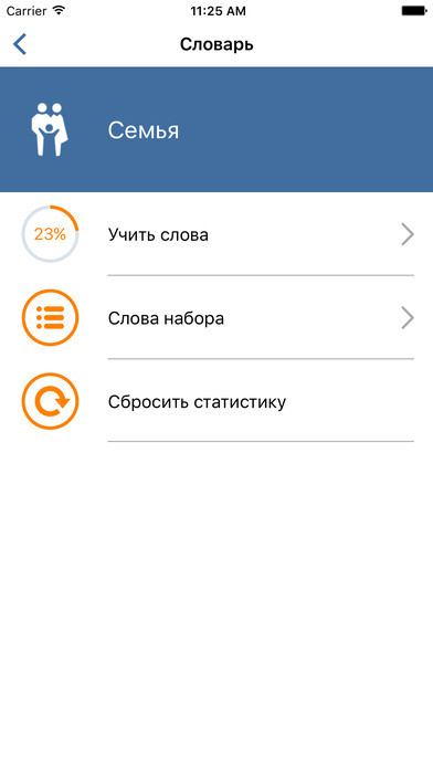 Процесс изучения слов начинается с того, что программа набирает из своего словаря 15 слов и начинает их показывать в случайном порядке.После того, как слово переходит в группу "повторяемые" из словаря извлекается следующее слово.
