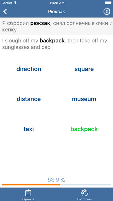 Программа предлагает вам на русском языке слово и предложение с этим словом. Вам необходимо ответить, как данное слово в текущем контексте должно быть переведено на английский язык.