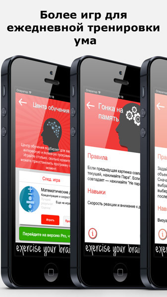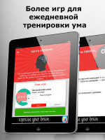 Испытайте свой мозг! "Игры ума" — это собрание удивительных развивающих игр, разработанных с учетом принципов когнитивной психологии и направленных на развитие ваших умственных способностей. В приложение входит более 30 обучающих игр (некоторые из них доступны в бесплатной версии только три раза). Во всех играх ведется учет ваших успехов, с цифрами и графиками. На странице списка игр приводятся ваши лучшие результаты за все время и за текущий день. Все показатели оцениваются по общей шкале, и вы легко сможете увидеть, над какими именно навыками вам нужно работать. Тренируйте концентрацию, скорость реакции, память, гибкость мышления и общие знания.