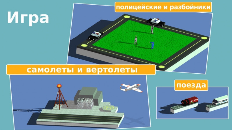 - Люди ходят в здания, полицейские преследуют разбойников и поезда, пробирающихся по городу.