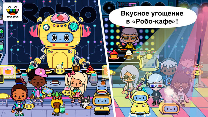 Проголодались? Отдохните с друзьями в «Робо-кафе». Перекусите, взяв еду прямо с конвейерной ленты, или закажите смузи у гигантского робота. Четыре незабываемых вкуса на выбор – интересно, какой вы выберете?СКАЧАЙТЕ NEIGHBORHOOD СЕЙЧАС – ПОЛУЧИТЕ ЦЕЛЫЙ МИР TOCA LIFE В БЛИЖАЙШЕМ БУДУЩЕМ